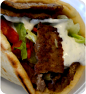 Delicious roasted beef served in a pita with tomatoes, onions, and tzatziki sauce.